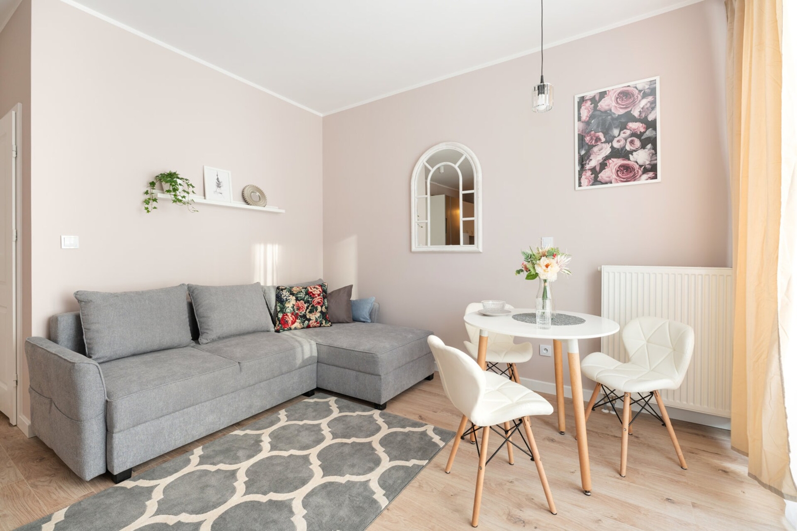 — SALON Rozkładana sofa, stolik kawowy, szafka RTV, telewizor, stół z 4 krzesłami. — SYPIALNIA Duże łóżko podwójne, stoliki nocne, szafa. — ANEKS KUCHENNY Płyta indukcyjna, piekarnik, zmywarka, mikrofalówka, czajnik, lodówka z zamrażarką, szklanki, komplet garnków, sztućców, patelnia. — ŁAZIENKA Prysznic i wanna, toaleta, umywalka, lustro, pralka, suszarka do włosów, ręczniki. Dodatkowe udogodnienia: żelazko z deską do prasowania. Dostępne multimedia: telewizja oraz internet Wi-Fi. Rezerwując nasz apartament akceptujecie Państwo nasz regulamin.