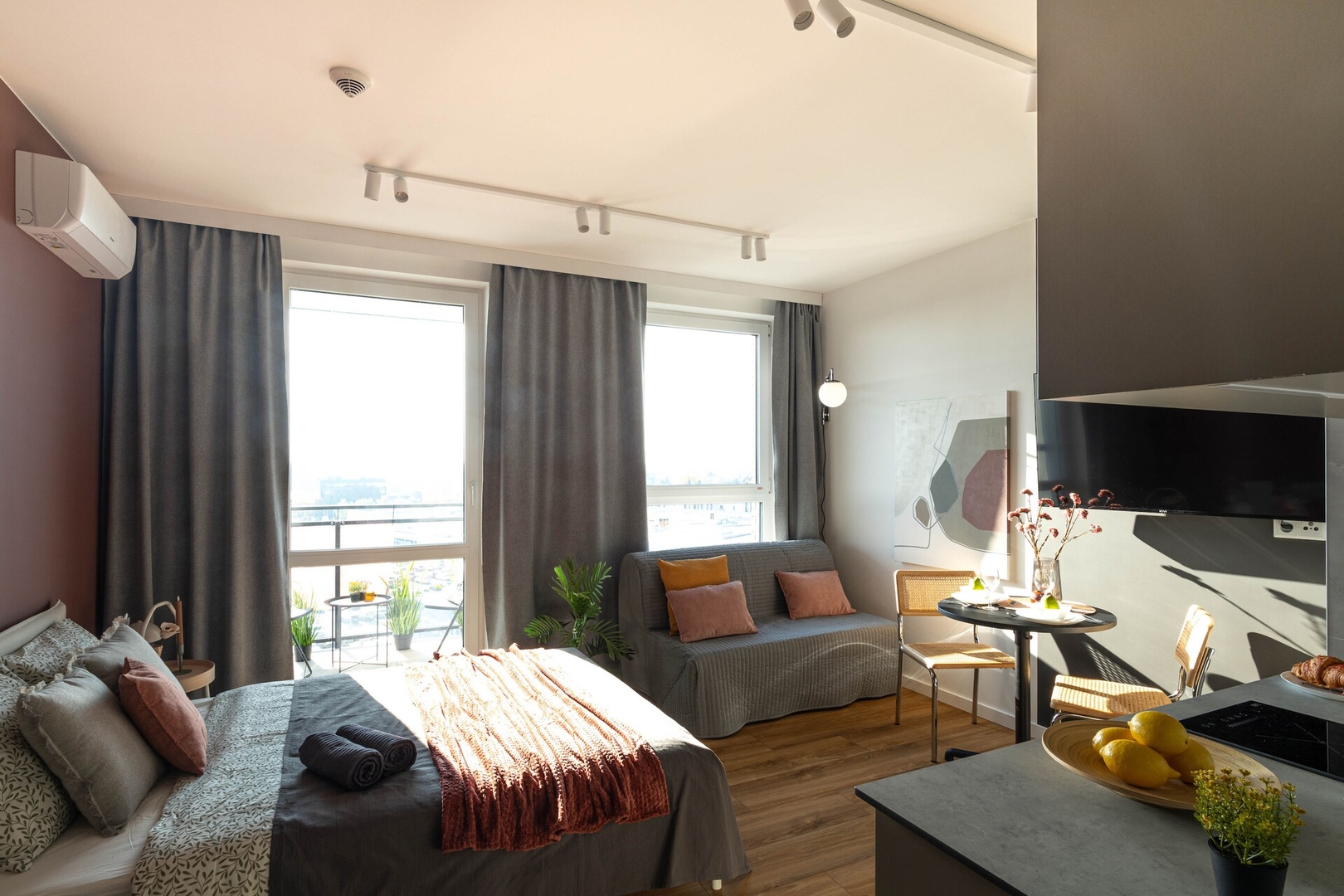 Salon z rozkładaną sofą, łóżkiem dwuosobowym, pościelą, szafką RTV, telewizorem, klimatyzacją, szafą oraz stołem jadalnianym. Aneks kuchenny z płytą indukcyjną, czajnikiem, lodówką z zamrażarką, szklankami, kompletem garnków, sztućcami, patelnią, zmywarką oraz mikrofalówką. Łazienka z prysznicem, toaletą, umywalką, lustrem, suszarką do włosów oraz ręcznikami. Dodatkowe udogodnienia: żelazko z deską do prasowania, suszarka na pranie, brak pralki. Dostępne multimedia: telewizja oraz internet Wi-Fi. Zwierzęta: Zwierzęta są akceptowane. Parkowanie: Bezpłatny parking w pobliżu. Rezerwując nasz apartament, akceptują Państwo nasz regulamin.