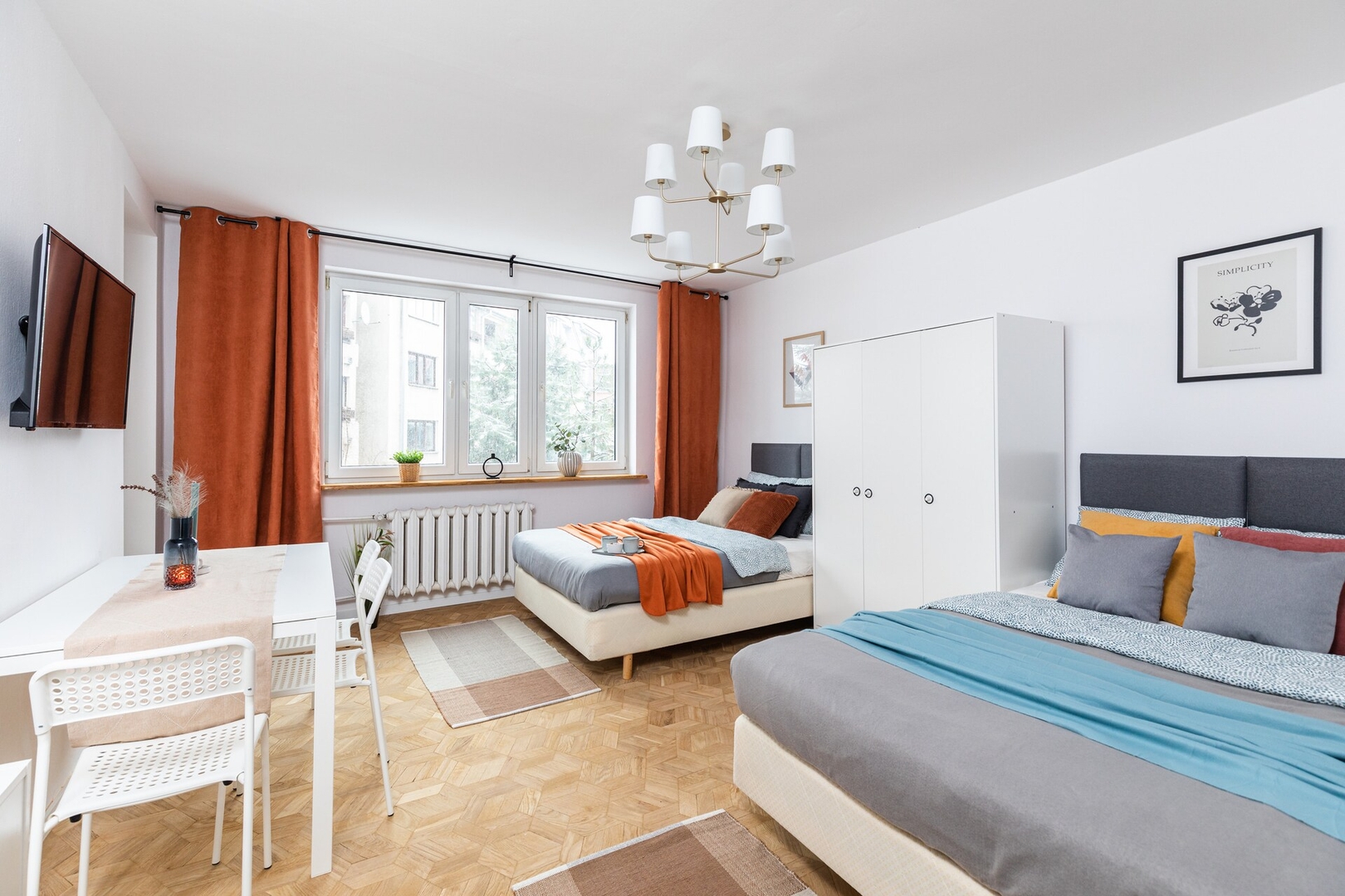 — ROOM: Two double beds, bedding, table with chairs, wardrobe, and a balcony. — SHARED KITCHEN: Refrigerator, dishwasher, 4-burner gas stove, oven, microwave, basic kitchenware, electric kettle, a set of pots, frying pan, cutlery. — SHARED BATHROOM 1: Shower, toilet, washing machine, sink, mirror, hairdryer, and towels. — SHARED BATHROOM 2: Toilet, sink, mirror, cabinet. — OTHER AMENITIES: Iron with ironing board, drying rack. — MULTIMEDIA: Wi-Fi internet, TV. — PETS: Pets are not allowed. By booking our apartment, you agree to our house rules. SuperApart Sp. z o.o.