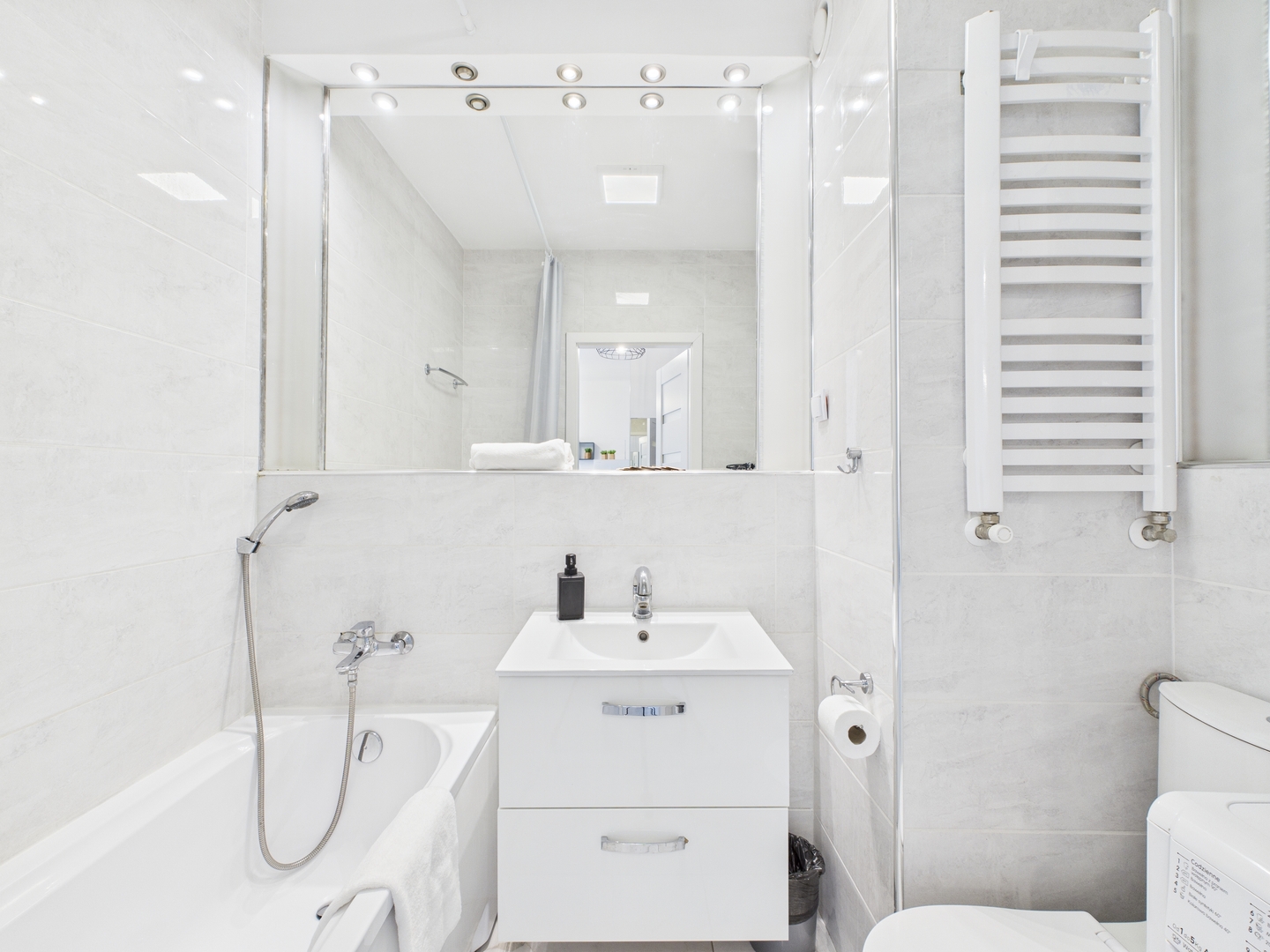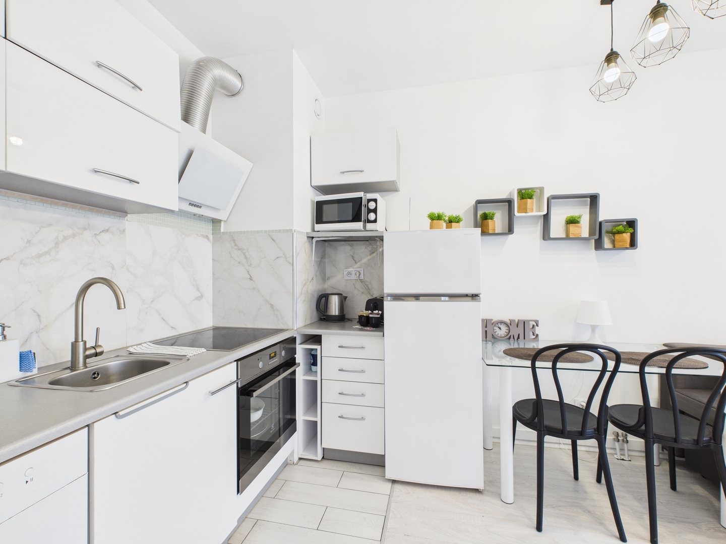 — LIVING ROOM Fold-out sofa, coffee table, TV stand, television, dining table with four chairs. — BEDROOM Large double bed, nightstands, wardrobe. — KITCHENETTE Induction hob, oven, dishwasher, microwave, kettle, fridge with freezer, glasses, set of pots, cutlery, frying pan. — BATHROOM Shower and bathtub, toilet, washbasin, mirror, washing machine, hairdryer, towels. Additional amenities: iron with ironing board. Available multimedia: TV and Wi-Fi internet. By booking our apartment, you accept our terms and conditions.