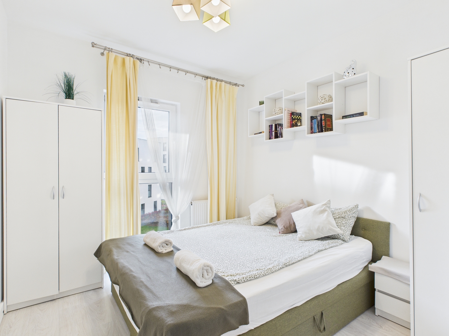 Two-room apartment with a large balcony near the Intensive Care Center Olinek A spacious two-room apartment in Warsaw's Mokotów district is an excellent choice for four people. Fully equipped, it ensures comfort, relaxation, and enjoyment throughout your stay. The apartment is located on the 1st floor of a building with an elevator, ensuring convenient access.