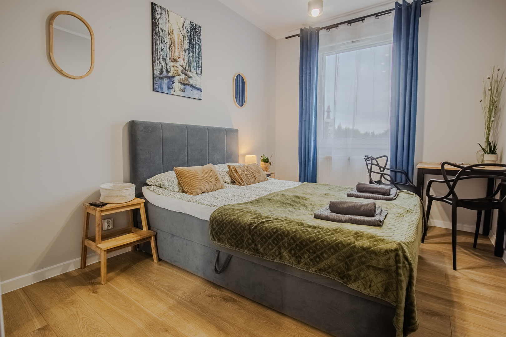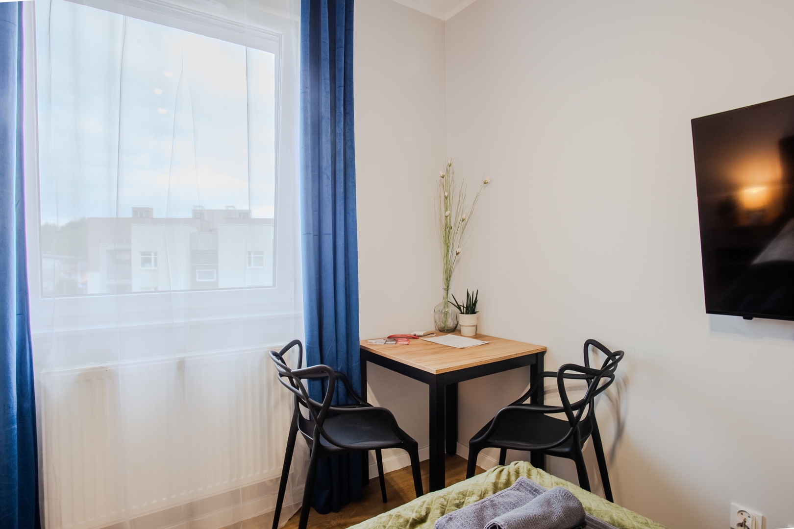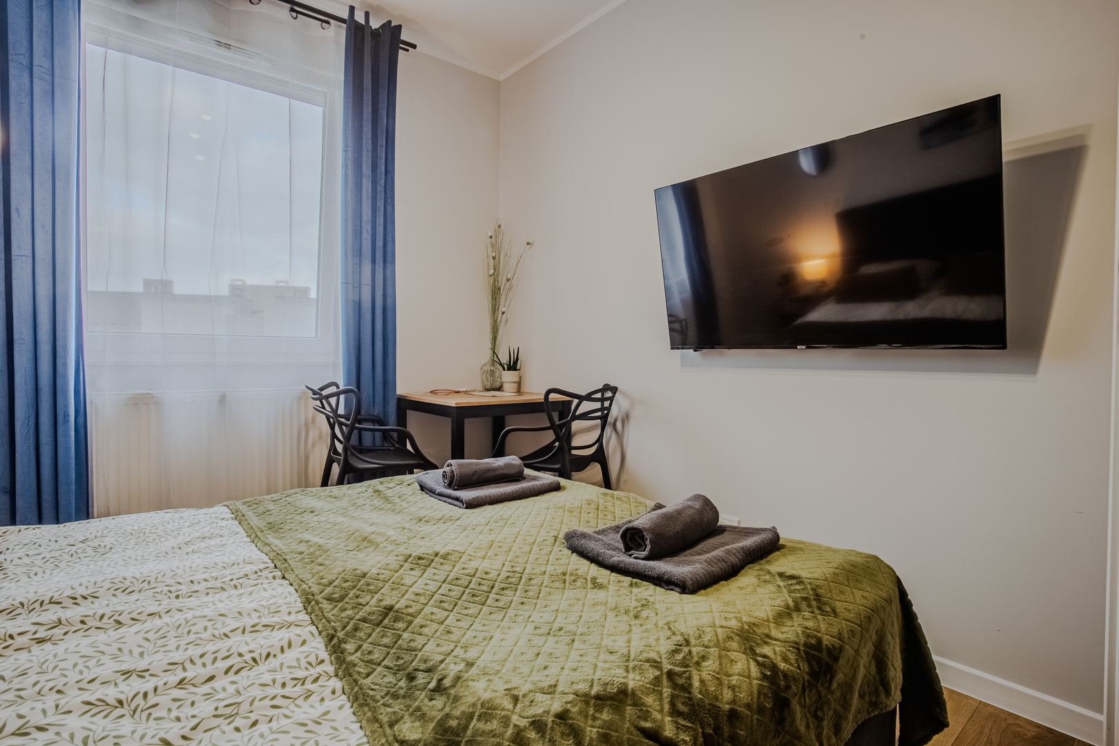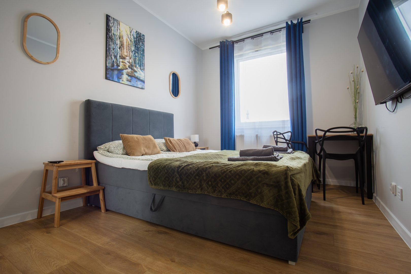 Room: Bed, bedding, desk with chair, coffee table, TV stand, television, and wardrobe. Shared kitchen: Induction hob, kettle, oven, dishwasher, microwave, fridge, glasses, full set of pots, cutlery, frying pan. Bathroom: Bathroom with a bathtub, toilet, sink, mirror, hairdryer, towels. Other: Iron with ironing board and drying rack are located in the shared area. Multimedia: TV, Wi-Fi internet. Pets: Pets are not allowed. Parking: Free parking available. (Please ask for availability). By booking our apartment, you accept our terms and conditions.