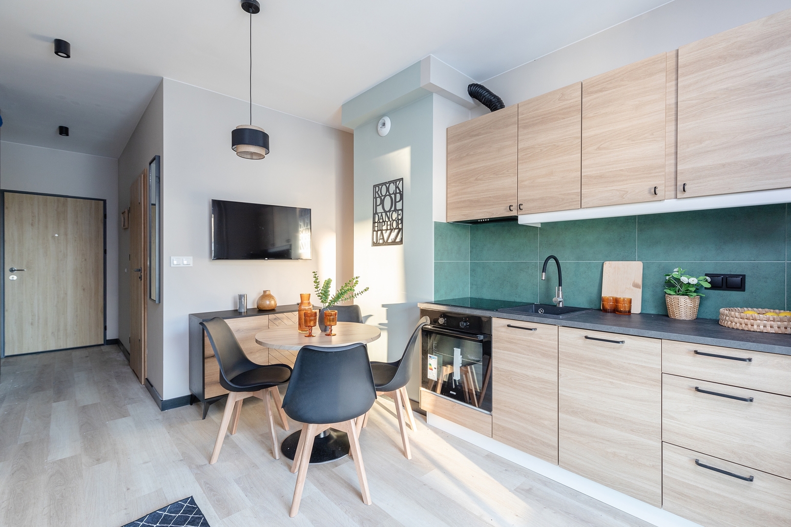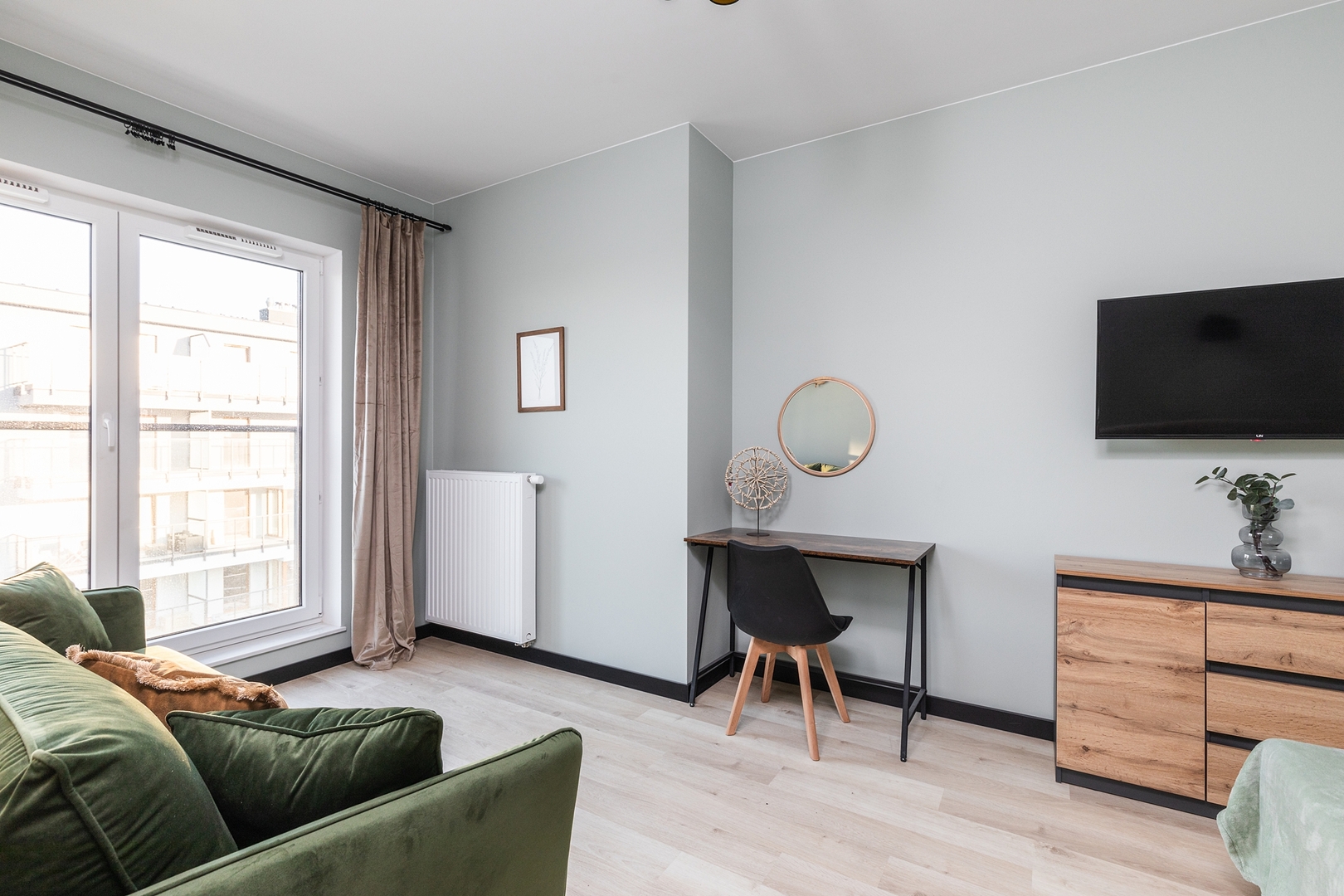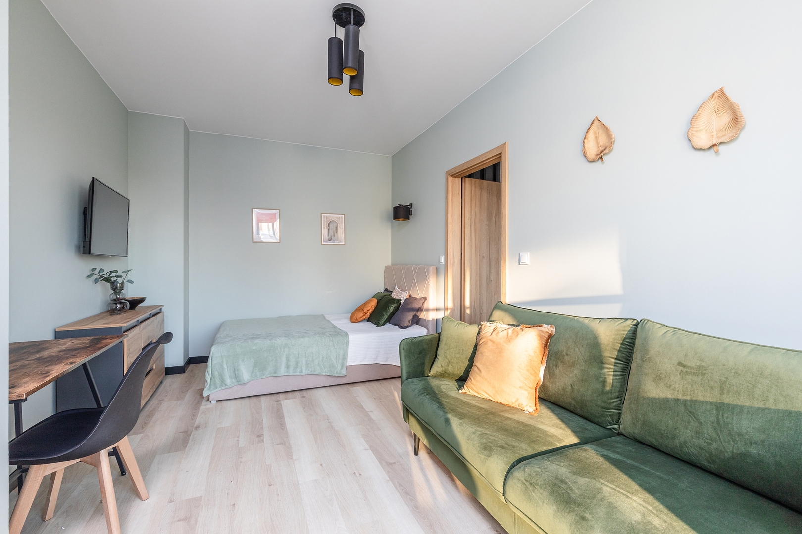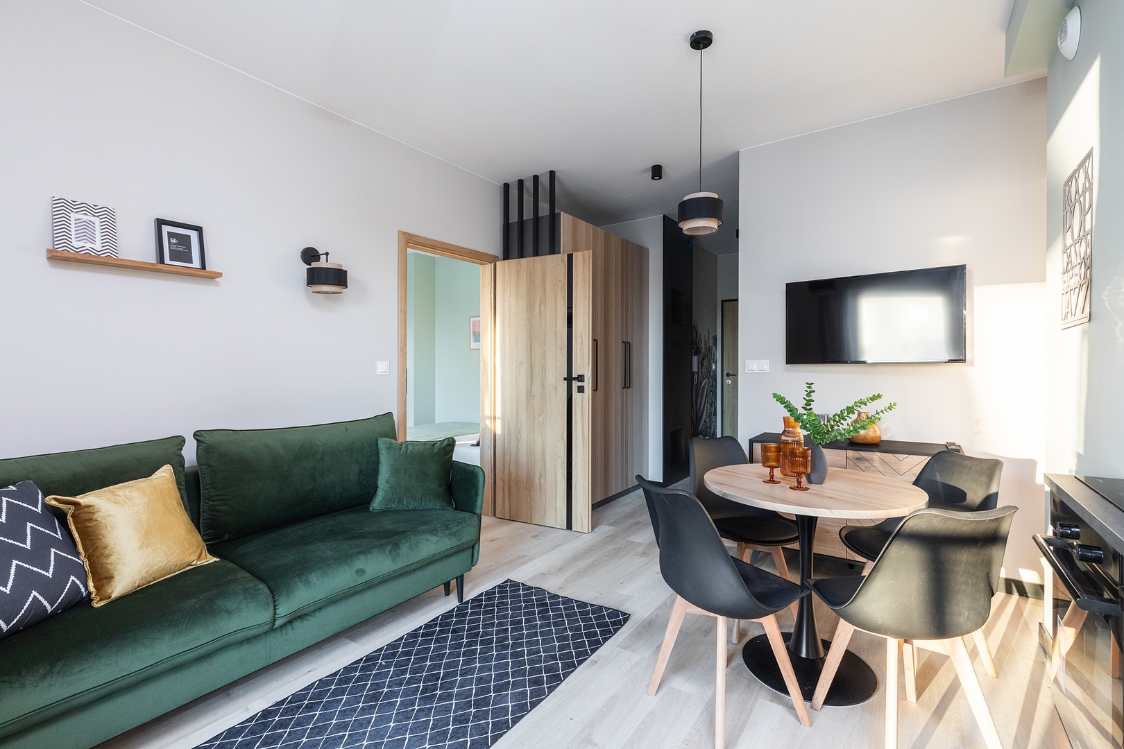 Cozy living room with a sofa bed, coffee table and spacious dining table. Comfortable bedroom with a double bed, additional sofa, bedside tables, large wardrobe and TV. Fully equipped kitchen with induction hob, oven, fridge with freezer, kettle and a set of dishes and pots. Modern bathroom with shower, washing machine, hairdryer and towels. Pets are allowed for an additional fee. By booking our apartment, you accept our regulations.