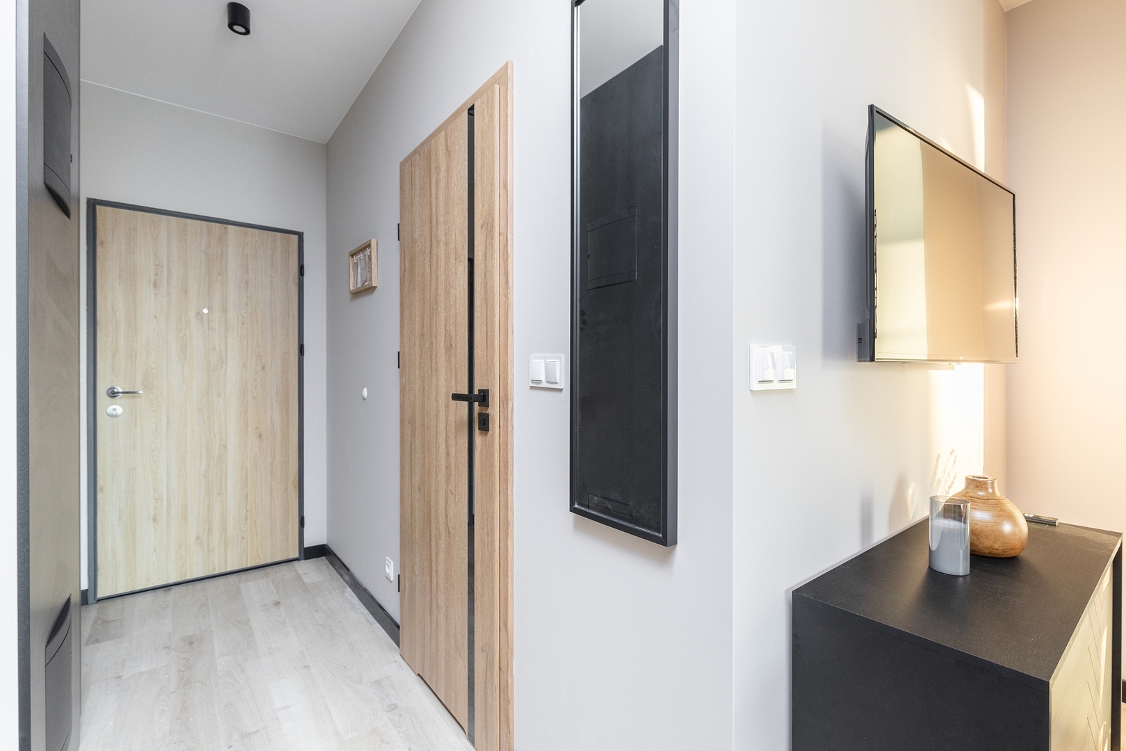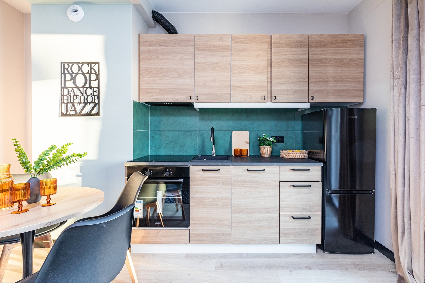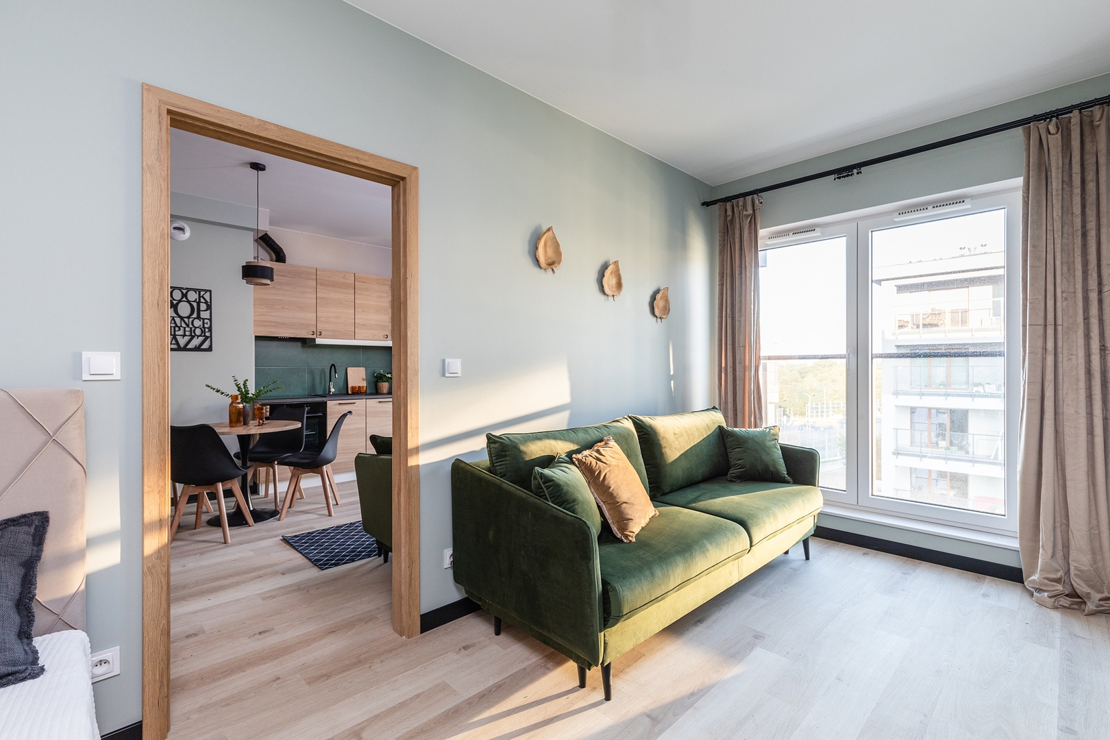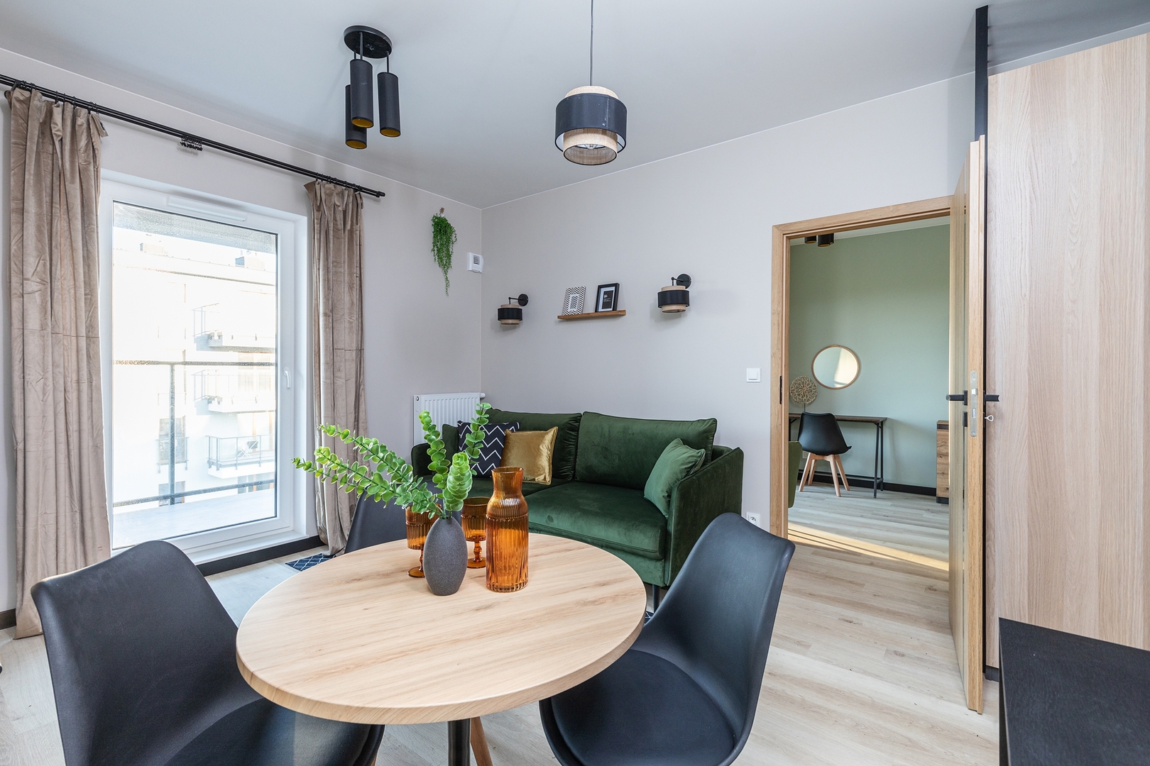 Cozy living room with a sofa bed, coffee table and spacious dining table. Comfortable bedroom with a double bed, additional sofa, bedside tables, large wardrobe and TV. Fully equipped kitchen with induction hob, oven, fridge with freezer, kettle and a set of dishes and pots. Modern bathroom with shower, washing machine, hairdryer and towels. Pets are allowed for an additional fee. By booking our apartment, you accept our regulations.